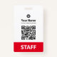 Personnalisez facilement ces badges de nom d'entreprise sans photo, avec le code Qr lisible (ça marche toujours!) et le code Bar et le logo de grande entreprise. Cette société id maker a un design de marque de nom d'entreprise simple en rouge et blanc entièrement personnalisable en tailles avant et arrière, sans-serif polices de base et moderne et un look professionnel et clair, parfait pour les employés de petite entreprise, patron, invités. Ces fournitures de badges d'identification d'entreprise sont disponibles avec cordon, clip métallique ou avec rétractable. Profitez de l'excellent service d'impression de badge de Zazzle! Pas de commande minimum, et plus vous achetez, plus vous économisez. Des rabais en vrac sont disponibles avec plusieurs commandes, pour différents employés aussi!