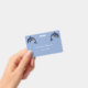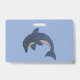 This name or identification badge is light blue with two glittery dolphins in dark blue and white in a jumping position on the front and one larger dolphin on the back. Customize your name and information with the templates.