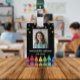 Badge d'enseignant à crayon vertical personnalisé avec photo, nom, niveau sous des étoiles colorées et au-dessus d'une rangée de crayons dans un dégradé d'arc-en-ciel. Badge d'enseignant de maternelle avec des crayons et des étoiles colorés.