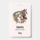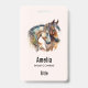 Nom badge avec une image représentant une paire de chevaux. Portant des bandeaux décoratifs. Entouré de plumes et de feuillage.