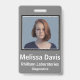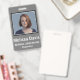 Badge d'identification de l'employé dans un design vertical classique. Fond gris acier. Tous les éléments sont modifiables ou amovibles. Les éléments comprennent : photo de l'employé, nom de l'employé, nom de l'entreprise, département de l'employé. Le verso du design comporte un scan de code-barres de sécurité. Fente en haut pour un cordon.