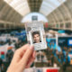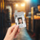 Carte d'identité photo avec photo et logo personnalisés sur un élégant design en brique de marbre. À l'arrière, vous pouvez ajouter un code à barres personnalisé ou un code QR et des textes supplémentaires (ou supprimer les modèles). Conçu pour une agence immobilière et personnalisable pour d'autres professionnels.