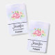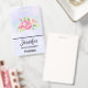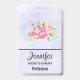 Nom badge avec une belle et élégante aquarelle créé bouquet floral. Fleurs de jardin roses entourées de feuillage vert clair. Arrière - plan d'aquarelle violette.