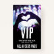 Concert Billet Tous Accès Special Événement Badge VIP. Idéal pour les concerts, les grands événements comme les conférences ou les conférences, et même les fêtes d'anniversaire. Cette conception comporte un clin d'oeil ludique à une scène de concert avec quelqu'un formant une ombre en forme de coeur avec leurs mains. L'arrière - plan présente maintenant des tons plus doux, adoucissant le mélange de teintes violet, bleu et blanc des lumières de concert pour une ambiance subtile et sophistiquée. En bas, le texte en gras met en surbrillance "VIP", le nom de l'événement, la date et "All Access Pass". Tous les détails du texte et les couleurs de police peuvent être customisés. Vous pouvez également remplacer la photo, bien qu'elle puisse ne pas s'estomper en noir de manière transparente en bas.