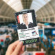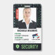 Medium sized vertical employee ID badge for your cyber security department, with a falling code background in green, cyan, and blue. Security is written at the bottom of the badge with a shield with a keyhole next to the text. Customize the security ID badge with name, title, department, ID number, issue date and expiration date, and logo. On the back, there's a QR code and additional customizable text.