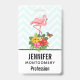 Badge avec une illustration numérique mignonne représentant un flamant rose sur une patte levée. Debout sur un bouquet de fleurs et de feuilles d'hibiscus tropical. Un joli papillon plane autour des fleurs. Un motif chevron vert clair et blanc en arrière-plan.