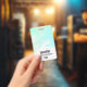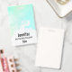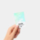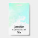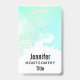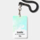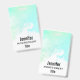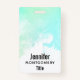 Une étiquette de nom avec une bordure abstraite le long du dessus avec des couleurs tourbillonnant vertes et bleues. Un design doux et estival. Une lumière croise la texture derrière l'image.