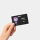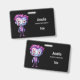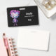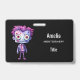 Nom badge avec une jolie illustration. Monstre Frankenstein aux cheveux roses et violets et au manteau et à la cravate dapper.