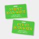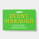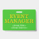 Ce design de badge élégant comporte le message "GÉRANT D'ÉVÉNEMENT". Un badge comme celui-ci pourrait peut-être être utilisé pour identifier que le porteur est un officiel lors d'un événement. [~Z0000307]