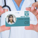Ce badge photo d'identité médical horizontal présente un design moderne blanc et bleu clair avec une photo ronde personnalisable. Personnalisable avec le nom et le logo de votre hôpital, ainsi que votre photo, nom, position, ID et emplacement. Au verso, vous pouvez ajouter des informations utiles en coque de perte.