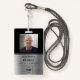 Carte d'identité photo de l'employé en argent moderne personnalisée Noir. Personnalisez ce badge de carte d'identité d'entreprise avec le nom, la position, la photo et le logo de votre entreprise sur le côté avant et votre texte d'information personnalisé sur le côté arrière. La photo de l'employé fonctionne le mieux en format carré. Votre logo fonctionne le mieux comme un format carré png avec arrière - plan transparent. Le logo réservé que vous voyez sur le badge sera complètement remplacé par votre propre logo.