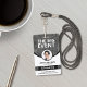 Un badge d'identification moderne pour les invités de conférence et d'événement, les vip, les conférenciers ou le personnel. Le dessin montre la photographie des personnes, ainsi que le nom et la profession des personnes. La désignation des personnes est indiquée en lettres blanches sur un arrière - plan coloré. Le badge d'identification de conférence moderne peut être personnalisé photo arrière - plan appropriée derrière le titre de l'événement si désiré. Le verso de ce badge d'identification est vide et ouvert pour vous permettre d'ajouter plus d'informations, comme un code à barres ou les détails des commanditaires d'événements. Les couleurs peuvent être personnalisées pour correspondre au jeu de couleurs de votre entreprise. Version noire.