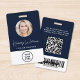 badge professionnel moderne d'identité bleue avec photo de votre employé dans un cadre circulaire, son nom dans un script blanc chic et son titre en lettres blanches simples, et son logo d'entreprise. Au verso, ajoutez des informations supplémentaires et des codes QR et barres optionnels.