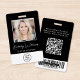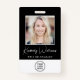 Un badge d'identification d'employé noir moderne et professionnel avec leur photo, leur nom dans un script blanc élégant et leur titre en lettres blanches simples, et le logo de votre entreprise ou organisation. Au verso, ajoutez des informations supplémentaires et des codes QR et barres optionnels.