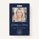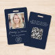badge d'identification bleu professionnel avec photo de votre employé, son nom dans un script blanc chic et son titre en lettres blanches simples, et le logo de votre entreprise ou de votre organisation. Au verso, ajoutez des informations supplémentaires et du code QR facultatif.