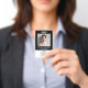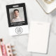 Un badge de nom d'employé noir moderne et professionnel portant sa photo, son nom et son titre, ainsi que le logo de votre entreprise ou de votre organisation. Au contraire, ajoutez des informations supplémentaires ; entrez une adresse URL du site Web pour créer un code QR numérisable.
