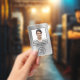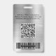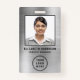 badge de nom professionnel moderne avec leur photo, nom et position, et le logo de votre entreprise ou organisation contre un faux arrière - plan métallique en argent. Au verso, ajoutez des informations supplémentaires et des codes QR et barres optionnels.