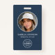 Impressionnez avec un badge d'identification élégant et professionnel. Ce modèle recto verso présente votre photo d'identité en cercle et est personnalisé avec un nom, un logo, des coordonnées et un code QR scannable. Customisez le texte correspondant à votre marque. Ce design moderne conviendra à de nombreux lieux de travail et professions différents, y compris les professionnels d'entreprise, les vendeurs au détail, les consultants en beauté, le personnel de l'hôtel, les petites entreprises, les étiquettes de nom de conférence et plus encore! Couleurs imprimées : ardoise bleu, noir et blanc.