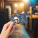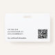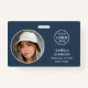 Impressionnez avec un badge d'identification élégant et professionnel. Ce modèle recto verso présente votre photo d'identité en cercle et est personnalisé avec un nom, un logo, des coordonnées et un code QR scannable. Customisez le texte correspondant à votre marque. Ce design moderne conviendra à de nombreux lieux de travail et professions différents, y compris les professionnels d'entreprise, les vendeurs au détail, les consultants en beauté, le personnel de l'hôtel, les petites entreprises, les étiquettes de nom de conférence et plus encore! Couleurs imprimées : ardoise bleu, noir et blanc.