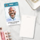 A modern and simple badge that does not distract from the important details. Easy to read from afar. Add a custom logo and company details. Add the employee's name, photo, and professional title. The bar of color can be modified to match the company's official colors. At the back, add more information such as return address and the employee's ID number. Perfect for round shaped logos.