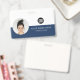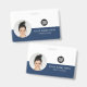 Personnalisez facilement ce badge de nom d'employé minimaliste horizontal personnalisé avec photo, nom, profession et logo d'entreprise. Un design d'entreprise simple avec photo ronde, en bleu marine et blanc entièrement personnalisable à l'avant et à l'arrière avec le même design, sans-serif polices basiques et modernes et un look professionnel et clair. Disponible avec cordon, clip métallique ou avec rétractable. Pas de commande minimum.