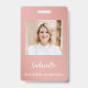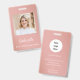 A chic and modern employee badge design for makeup artists and beauty professionals. This layout features a dusty rose background with leaf accents and elegant script typography. Perfect for salon owners, bridal makeup artists, and beauty consultants seeking a stylish, professional brand identity.