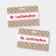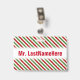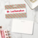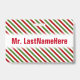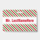 Ce modèle de badge présente un motif de bandes rouges, blanches et vertes. Ce sont des couleurs couramment associées à Noël. Il comporte également un nom personnalisé en texte de couleur rouge dans une bande de couleur blanche. Un badge comme celui-ci pourrait peut-être être porté par un enseignant, un éducateur, un tuteur ou un professeur pendant les premières semaines d'une année scolaire ou d'un cours. Cela pourrait aider les élèves à apprendre et à se souvenir du nom de leur enseignant. [~Z0000175]