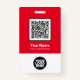 Personnalisez facilement ce badge personnalisé de nom d'employé avec ou sans photo, code Qr, code de barre d'analyse et logo d'entreprise. Un design d'entreprise simple en rouge et blanc entièrement personnalisable en tailles avant et arrière, sans-serif polices de base et moderne et un look professionnel et clair. Disponible avec cordon, clip métallique ou avec rétractable. Pas de commande minimum.