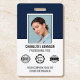 Créez une apparence professionnelle avec ce badge d'identification élégant. Un simple modèle personnalisé avec votre photo d'identité, nom, titre de travail, logo de l'entreprise et symboles d'accréditation. Les détails de retour sont au verso, ainsi que des informations supplémentaires, et un code à barres ou un code QR. Customisez le texte pour convenir à votre entreprise. Idéal pour de nombreux lieux de travail différents, y compris les professionnels d'entreprise, les consultants d'affaires, les vendeurs au détail, le personnel médical et plus. Couleurs imprimées : bleu marine très foncé, noir et blanc.