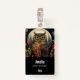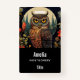 Name badge with a cool looking owl with a piercing stare. A full moon in the back with a garden of red flowers.