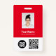 Personnalisez facilement ce badge personnalisé de nom d'employé avec Photo, Scan QrCode et Code barre et logo d'entreprise. Un design d'entreprise simple dans les yeux, des couleurs vives rouge et blanc entièrement personnalisables en tailles avant et arrière, des polices sans-serif basiques et modernes et un look professionnel et clair. Disponible avec cordon, clip métallique ou avec rétractable. Pas de commande minimum.