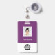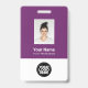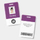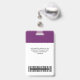 Personnalisez facilement ce Badge Violet Personnalisé de nom d'employé avec Photo, Scan Bar Code et logo d'entreprise. Un design d'entreprise simple dans les couleurs violet et blanc standard entièrement personnalisable en tailles avant et arrière, sans-serif polices de base et moderne et un look professionnel et clair. Disponible avec cordon, clip métallique ou avec rétractable. Pas de commande minimum.
