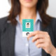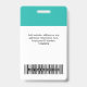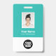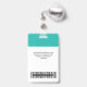 Personnalisez facilement ce badge de nom d'employé bleu clair Turquoise personnalisé avec photo, code de barre de numérisation et logo d'entreprise. Un design d'entreprise simple dans des couleurs turquoises, turquoise et blanche, entièrement personnalisable en tailles avant et arrière, sans-serif polices basiques et modernes et un look professionnel et clair. Disponible avec cordon, clip métallique ou avec rétractable. Pas de commande minimum.