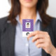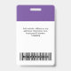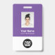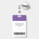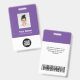 Personnalisez facilement ce badge de nom d'employé personnalisé violet avec photo, code de barre d'analyse et logo d'entreprise. Un design d'entreprise simple dans les couleurs standard violet foncé et blanc entièrement personnalisable dans les tailles avant et arrière, sans-serif polices de base et moderne et un look professionnel et clair. Disponible avec cordon, clip métallique ou avec rétractable. Pas de commande minimum.