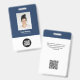 Personnalisez facilement ce badge personnalisé de nom d'employé avec photo, code Qr et logo d'entreprise. Un design d'entreprise simple en bleu marine et blanc entièrement personnalisable en tailles avant et arrière, sans-serif polices de base et moderne et un look professionnel et clair. Disponible avec cordon, clip métallique ou avec rétractable. Pas de commande minimum.