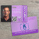 Conception moderne de badge d'identification pour les professionnels de la sécurité privée avec votre photo, nom, titre de travail, numéro d'identification, code QR et date d'expiration. L'arrière comprend le logo de votre entreprise et les coordonnées de retour. La disposition violette audacieuse assure une identification facile et une image professionnelle.