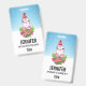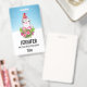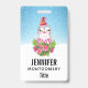 Nom badge avec un design mignon et fantaisiste avec un adorable pingouin portant un chapeau de santa rouge. Derrière un bouquet de fleurs aux sucres de canne rayés roses et blancs. Un arrière - plan d'hiver enneigé avec des flocons de neige tombant.