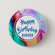 Un bouton d'anniversaire heureux personnalisé avec un design abstrait artistique sophistiqué. Peinture aquarelle avec les couleurs mélangeant et mélangeant créant un motif marbré fluide. Un cadre circulaire blanc superposé avec votre texte personnalisé écrit à l'intérieur.