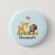 Bouton personnalisé avec une jolie illustration représentant un cerf de bébé et un petit écureuil tenant une glande et un papillon volant au-dessus de leur tête. Ces adorables créatures boisées se tiennent debout sur une herbe avec quelques champignons fantaisistes à leurs pieds. Arrière - plan bleu clair.