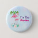 Je suis le bouton grand-mère avec l'illustration d'une maman (ou grand-mère !) et du flamant rose bébé debout sur un lit de fleurs florales succulentes avec des palmiers verts se balançant à l'arrière. Tropical et joli. L'arrière - plan est une aquarelle d'été bleu clair avec des touches de violet.