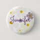 Ce bouton porte un nom violet dans une police scriptée moderne sur un graphique d'un éparpillement de marguerites comme des fleurs dans la crème pâle et la lavande violette foncée.