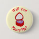 Quelle nouvelle façon de proposer à celui que vous aimez ? Un joli Bouton/Badge avec les mots 'Will you Marry Me' écrit en rouge avec une bague dans une boîte graphique sur un arrière - plan beige. Les mots peuvent être changés selon vos besoins.