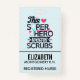 Nom badge avec un dicton mignon et génial. La typographie dit : Ce super-héros porte des gommages. Conçu avec un stéthescope bleu clair et un grand coeur rose et une ligne de moniteur de coeur rose. Un arrière - plan bleu clair aux pois roses défraîchis.