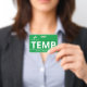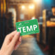 Badge à température verticale avec un design simple en blanc contre un arrière - plan vert. De grandes lettres propres permettent de reconnaître rapidement la température en tant que telle. Personnalisez avec le logo de votre entreprise.