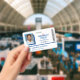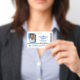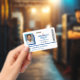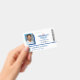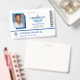badge d'identification de l'employé avec un design épuré minimaliste en bleu, noir et blanc où un cadre géométrique en bleu ciel et bleu profond entoure la photo de votre employé. Ajoutez votre logo en deux endroits. Une plus petite à côté du nom du lieu de travail et une plus grande sous le nom et le titre de l'employé. Une couche blanche transparente au-dessus du logo le garde à l'ombre pour que le texte soit visible. Ajoutez un code à barres et des informations supplémentaires si nécessaire.