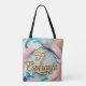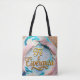 Uma bolsa tote com um design detalhado apresentando um close-up de um bolo decorado com penas. Este design único, com lettering fluido e estilo kirigami, simboliza a fé e a esperança. Com uma bela composição em 3D e resolução 4K, esta arte captura a essência da expectativa e beleza.