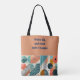 This tote bag design is special because it combines a modern geometric pattern with a vibrant yet balanced colour palette of teal, orange, and navy. The muted orange background adds warmth and complements the bold shapes, while the motivational quote in navy provides both contrast and inspiration. Its clean, artistic aesthetic makes it both stylish and meaningful, perfect for those who value creativity and positivity in their everyday items.