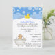 Jolie invitation à la douche pour bébé, faite en bleu et blanc, avec pois et graphiques d'un grand arc bleu pâle, avec un canard en caoutchouc décorant le milieu. OEuvre d'art country adorable d'un bébé dans une baignoire en bas à gauche. Personnalisez le texte en fonction de vos besoins de douche. Adorable invitation, timbres assortis, autocollants et enveloppes disponibles.