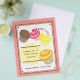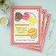 Ein Flyer mit einer Darstellung von vier Kuchen: Schokolade, Himbeere, Zitrone und Orange. Personalisieren Sie Ihre Veranstaltung mit Einzelheiten. com