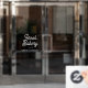 Ein White-Script-Firmenname-Branding-Fenster Dekorieren und Fensterklammern mit Geschäftsnamen und Untertitel. Ein personalisiertes Schaufenster, ideal für Schaufenster und Türbeschilderungen. Ideal für einen Geschäftshändler, der seine Haustür dekorieren oder sein Firmenname und seine Markendarstellung verändern möchte.